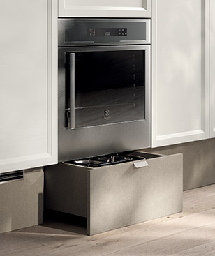 Non solo basi e pensili ma anche gli elettrodomestici sono collocabili a misura ideale e con aperture facilitate. Forni o lavastoviglie a scomparsa su basi o inseriti su colonne occupano la posizione desiderata, coadiuvati da zoccoli estraibili, facilmente utilizzabili.