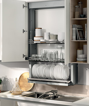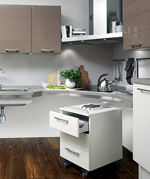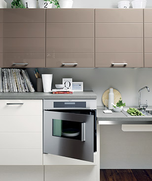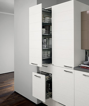 Collocati a misura ideale, gli elettrodomestici come il forno (disponibile con facilitata apertura laterale) sono comodamente utilizzabili, assieme al piano sagomato che permette pratici movimenti e a cassettiere con ruote collocabili a piacere nello spazio. Per adattare una cucina Scavolini alle proprie esigenze.