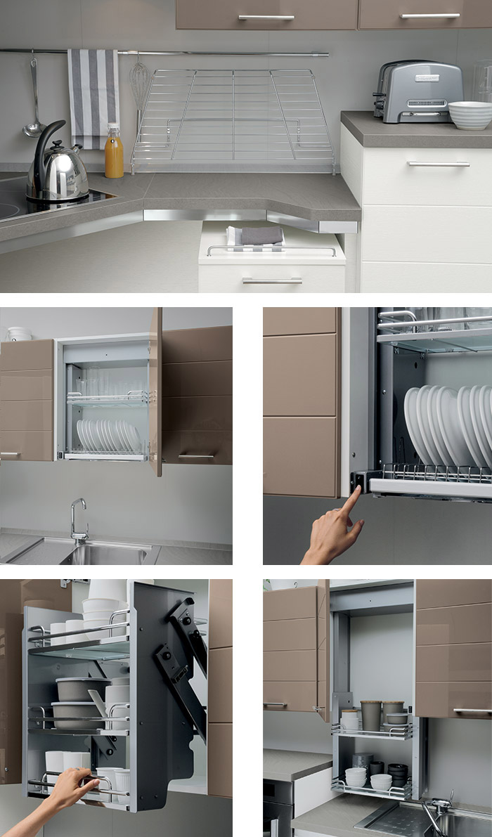 Un altro elemento caratterizzante è la griglia ribaltabile in metallo, complementare al piano, che consente di spostare agevolmente pentole e contenitori pesanti dal fornello al lavabo (e viceversa) senza sforzi e in sicurezza. Per rendere semplici i gesti in cucina utili sono i pensili saliscendi azionabili manualmente o attraverso un dispositivo automatico.