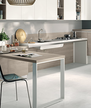 Per un ambiente più articolato che integra cucina e living si può introdurre nella composizione una penisola attrezzata (con estensione del piano di lavoro sospeso), che rende perfettamente raggiungibili i cestelli, la zona lavello e la zona cottura. Di facile utilizzo anche il Sistema Parete “Fluida”, vani a giorno o ante a ribalta a scelta, posizionabili in altezza in base alle diverse esigenze.